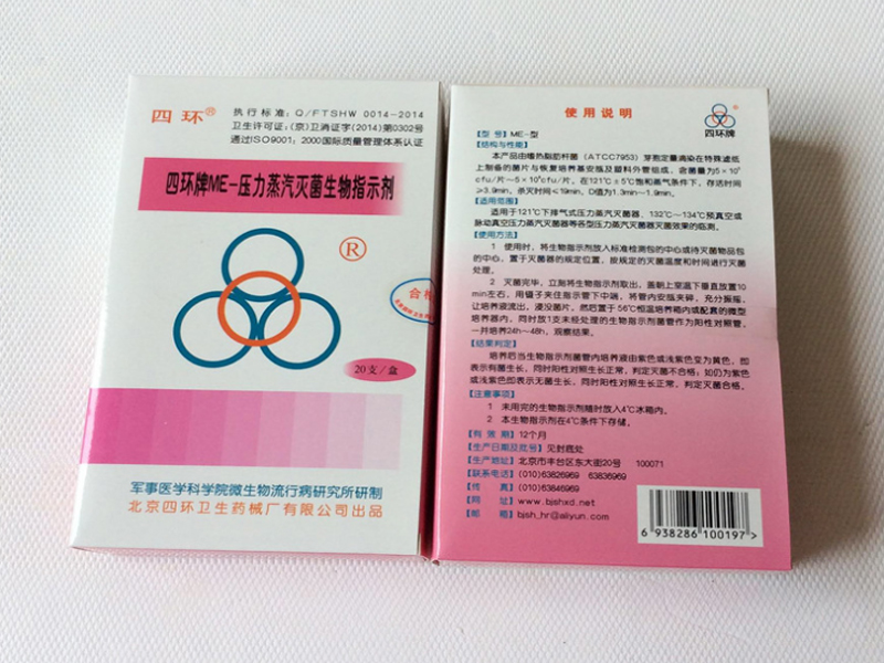 四環牌ME-型壓力蒸汽滅菌生物指示劑是由嗜熱指肪桿菌(ATCC 7953)芽孢菌片、恢復培養基和外管組成。
